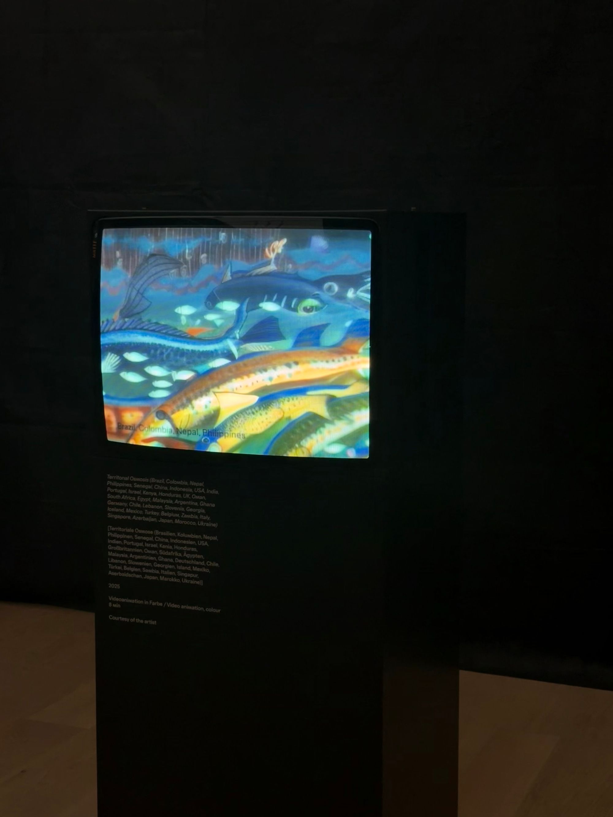 The work develops from Murillo’s long running Frequencies project and explores generative AI through a vast archive of canvases created by students in schools around the world. A selection of these drawings was digitised and used to train a generative model, producing moving images in which marks and gestures from different countries continuously merge, dissolve and transform. The work imagines a fluid visual geography where fragments of local imagination intertwine, forming hybrid pictorial spaces beyond fixed borders.